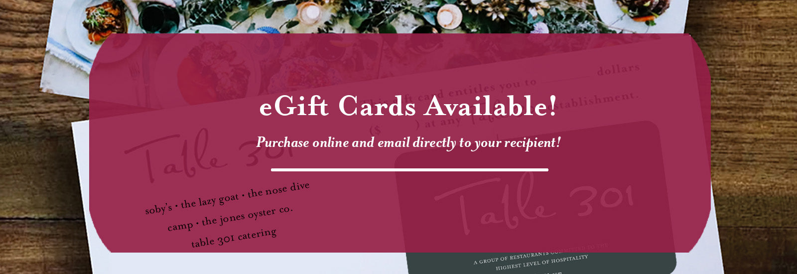 Table 301 Hospitality is a group of restaurants in Greenville, SC, that consist of people who truly love food and a group of businesses dedicated to the highest standards of hospitality. Diverse in exquisite flavors, and consistent in excellent service, Table 301 creates experiences that make Greenville, SC an irresistible stop on the culinary map. The group is made up of Soby’s, The Lazy Goat, NOSE DIVE, CAMP, The Jones Oyster Company, Tavola Italian, Lefty's West End Tavern, Table 301 Catering and The Loft at Soby’s.